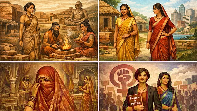 आधुनिक नारीवादी विमर्श में साड़ी केवल परिधान नहीं, बल्कि सत्ता और नियंत्रण का प्रतीक भी मानी जाती है। रेडिकल फेमिनिज़्म के अनुसार, स्त्रियों के पहनावे पर पितृसत्ता का नियंत्रण “निजी” नहीं बल्कि “राजनीतिक” है—जिसे कैरोल हैनिस्क ने अपने निबंध Personal is Political (1969) में स्पष्ट किया।