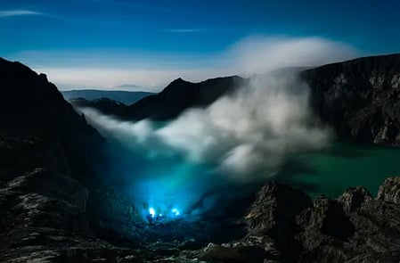 इजेन का सबसे रहस्यमयी आकर्षण नीली आग (ब्लू फायर) का दृश्य है। क्रेटर की दरारों से निकलने वाली सल्फ्यूरिक गैसें 360 डिग्री सेल्सियस से अधिक तापमान पर जलती हैं। सल्फर और ऑक्सीजन की प्रतिक्रिया से नीली लपटें बनती हैं। आम ज्वालामुखियों में लाल या नारंगी आग दिखती है, लेकिन इजेन में उच्च सल्फर सांद्रता के कारण नीली आग बनती है। सूरज की रोशनी में यह दृश्य छिप जाता है, इसलिए यह केवल रात में ही साफ दिखता है।